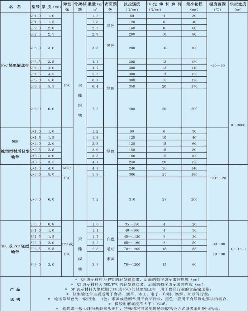 性能分類:輕度爬坡輸送帶,高度爬坡輸送帶,加擋板提升輸送帶,垂直升機皮帶,防滑輸送帶.砂光機輸送帶,耐磨輸送帶.較重物品輸送帶,輕質物品輸送帶,導向防跑偏輸送,打孔吸風輸送帶(吸風機皮帶>,帶耙釘輸送皮帶,螺旋提升輸送帶,轉彎提升輸送帶,超寬物品輸送帶,海綿輸送帶.挖槽輸送帶,加擋塊輸送帶,封邊輸送帶,槽型輸送帶,刀口輸送帶等。